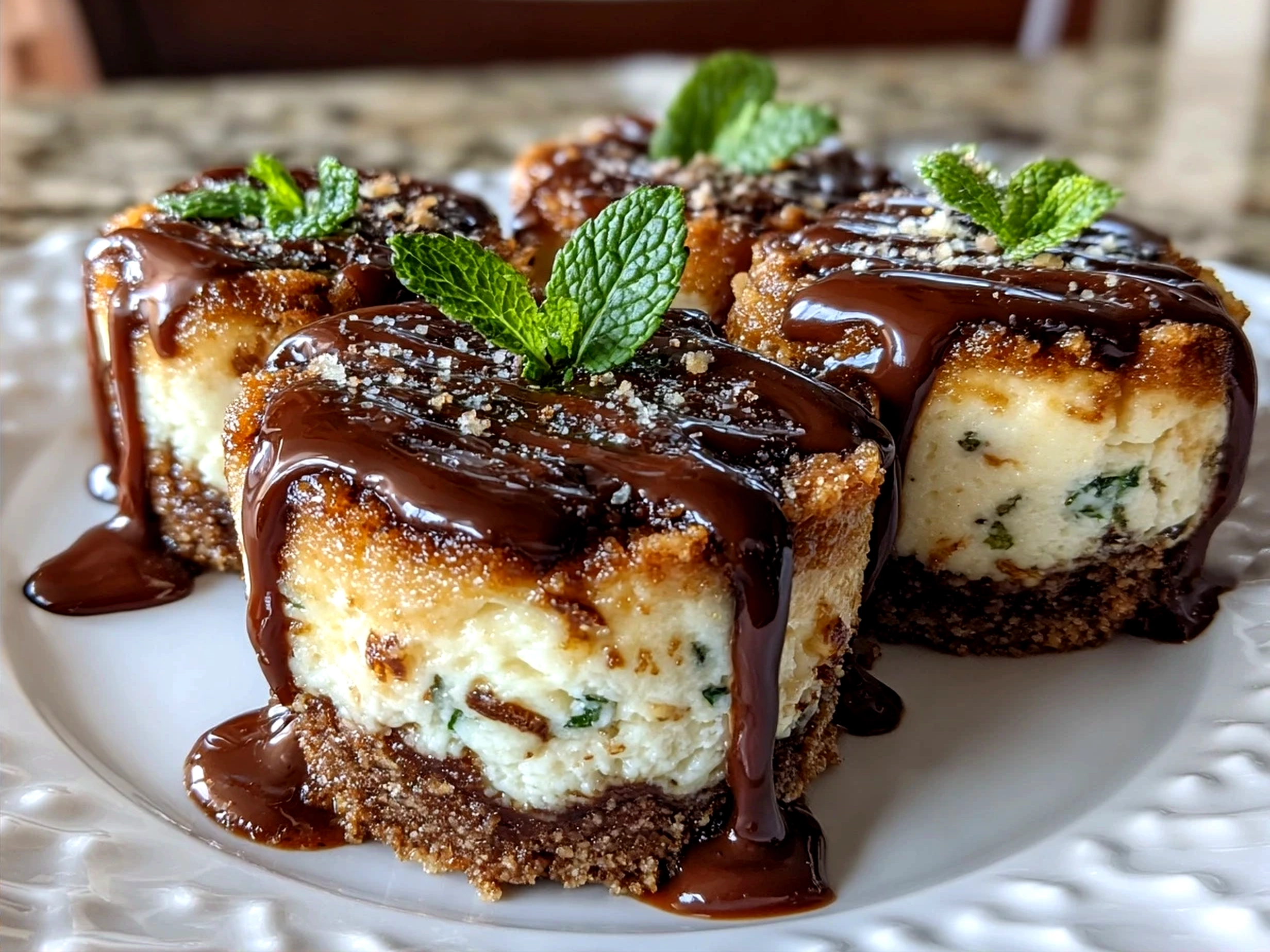 Finished Andes Mint Mini Cheesecakes ready to serve with chocolate drizzle