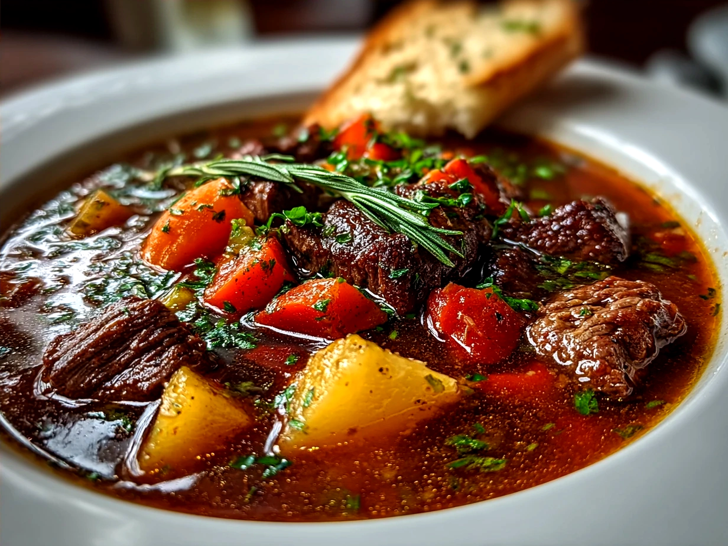 A bowl of hearty beef vegetable soup garnished with fresh parsley