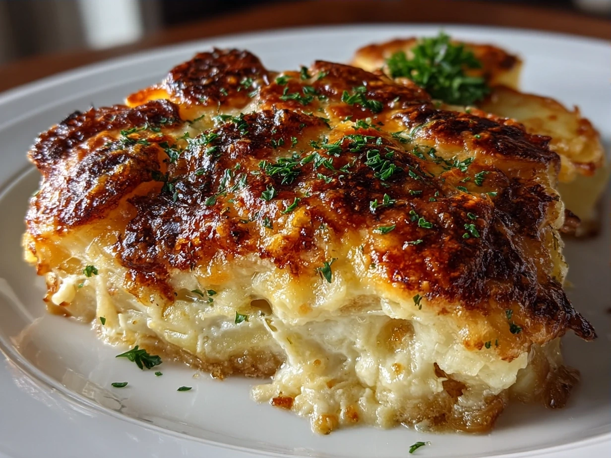 For presentation, I like to sprinkle a little bit of chopped fresh parsley over the top of the Cheesy Au Gratin Potatoes Recipe before serving. It adds a pop of color and freshness.