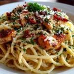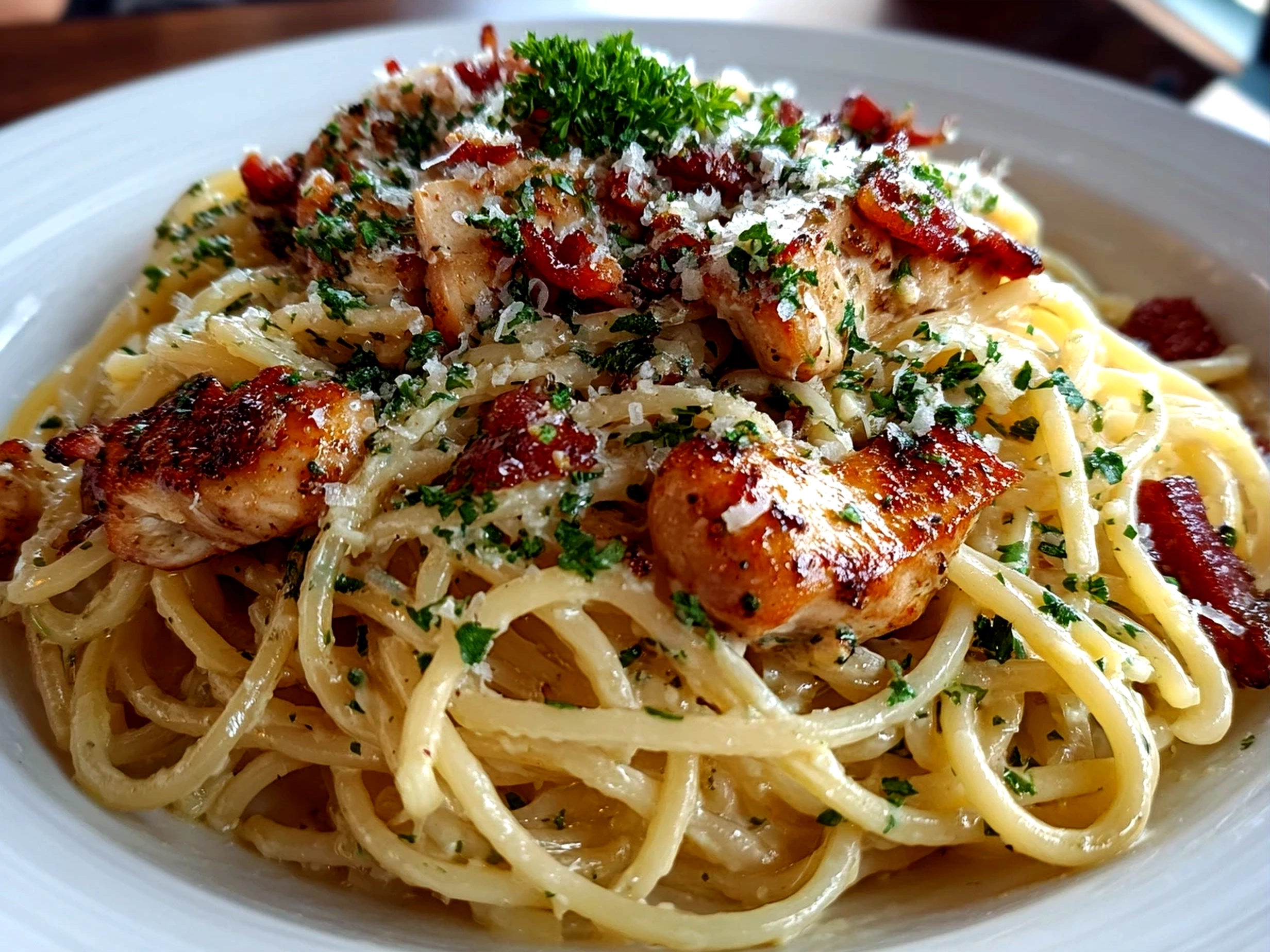 A creamy and comforting Italian pasta dish featuring tender chicken, crispy pancetta, and a rich egg-based sauce infused with Parmesan cheese and black pepper.