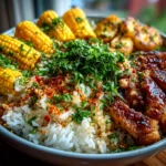This Chicken Rice Bowl with Street Corn is a vibrant and flavorful dish combining tender grilled chicken, zesty street-style corn, and fluffy rice for a satisfying and easy meal.