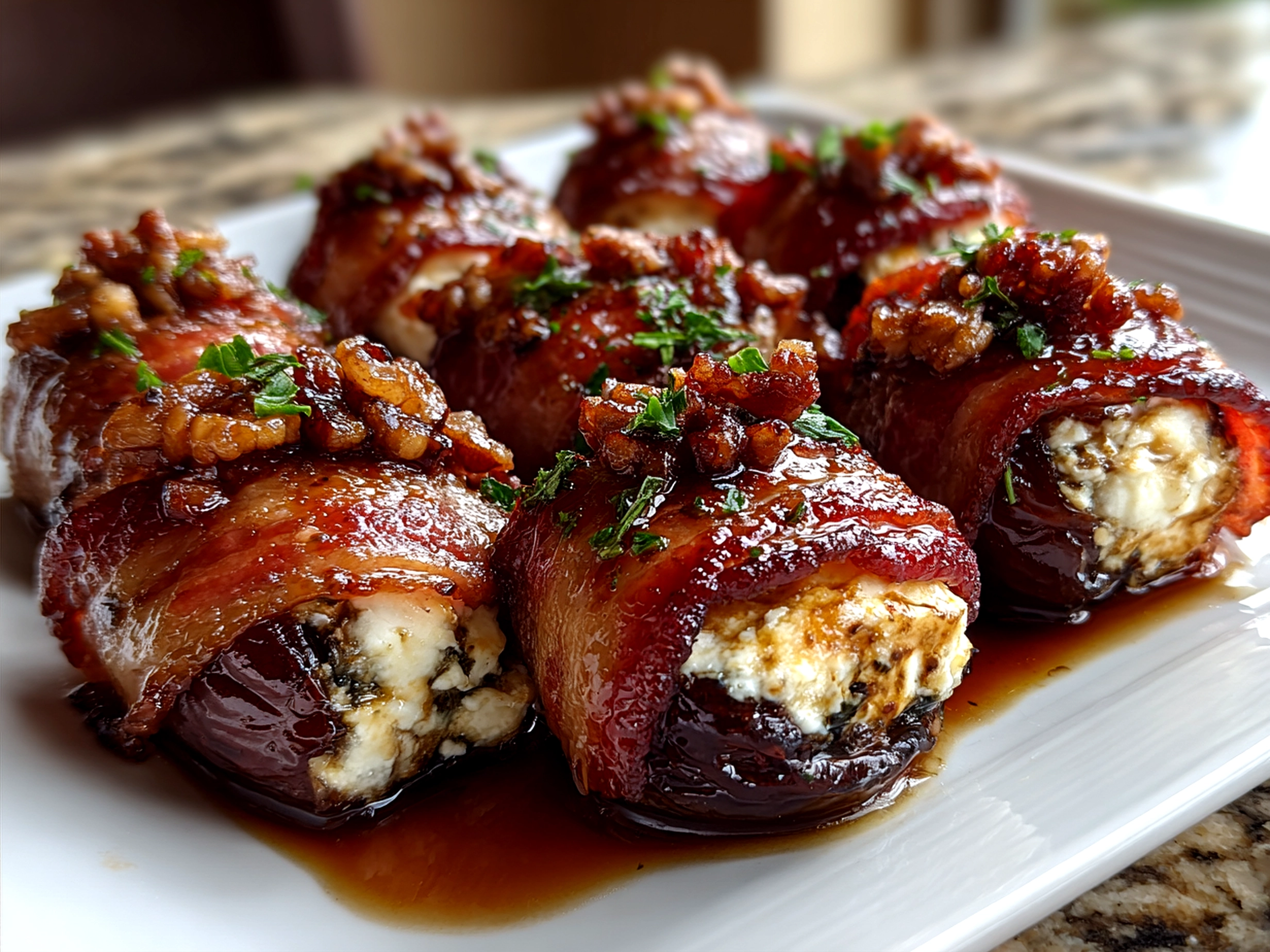 Delight in the perfect appetizer with sweet dates stuffed with creamy goat cheese and wrapped in crispy bacon, offering a delicious balance of flavors and textures.