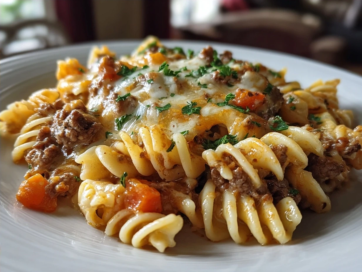 A hearty and comforting casserole featuring tender ground beef, noodles, and a creamy cheese sauce baked to perfection. Perfect for a family-friendly dinner that’s both satisfying and easy to prepare.