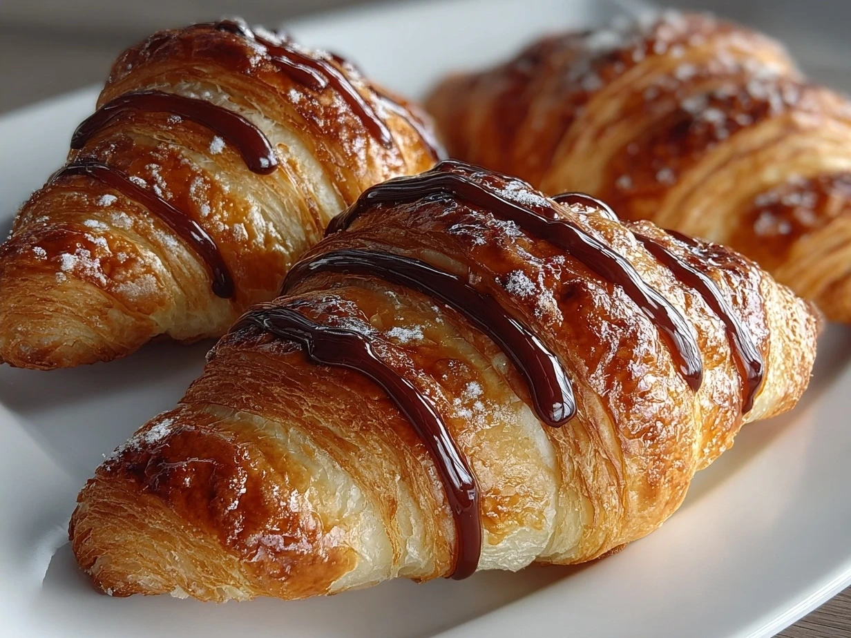 Homemade Chocolate Croissants, golden brown and flaky, served on a wooden board.
