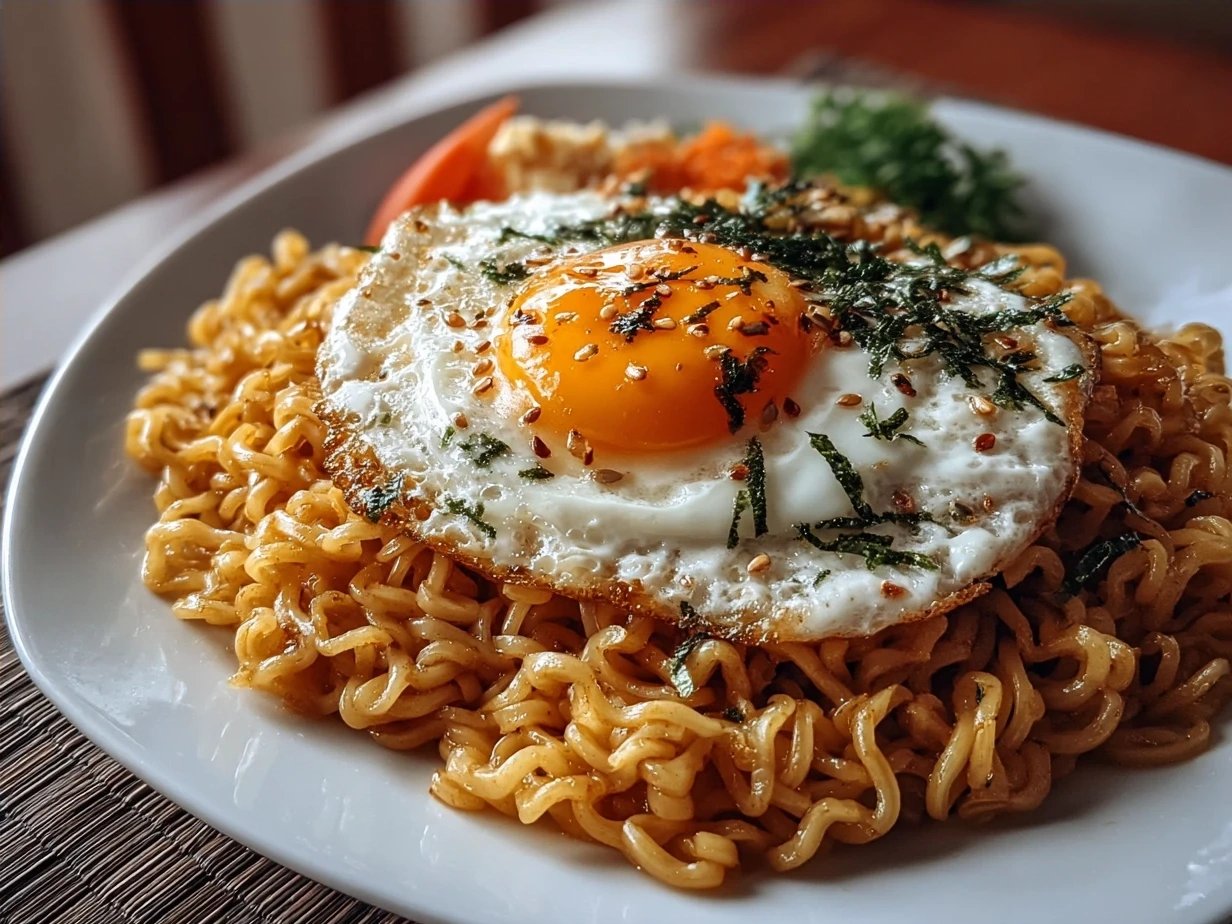 A quick and delicious dish combining savory instant noodles with rich egg, creamy butter, and fragrant garlic for a comforting meal in minutes.