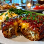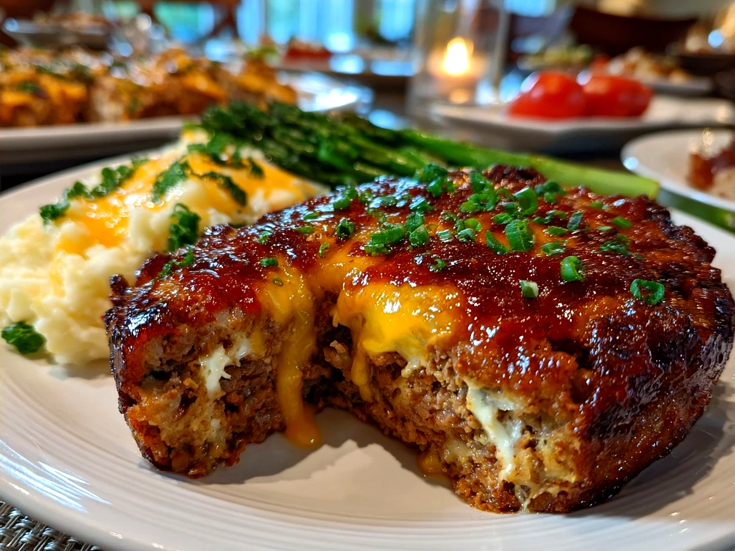 A savory meatloaf packed with creamy mashed potatoes, melted cheese, and crispy bacon, delivering a comforting twist on a classic favorite.