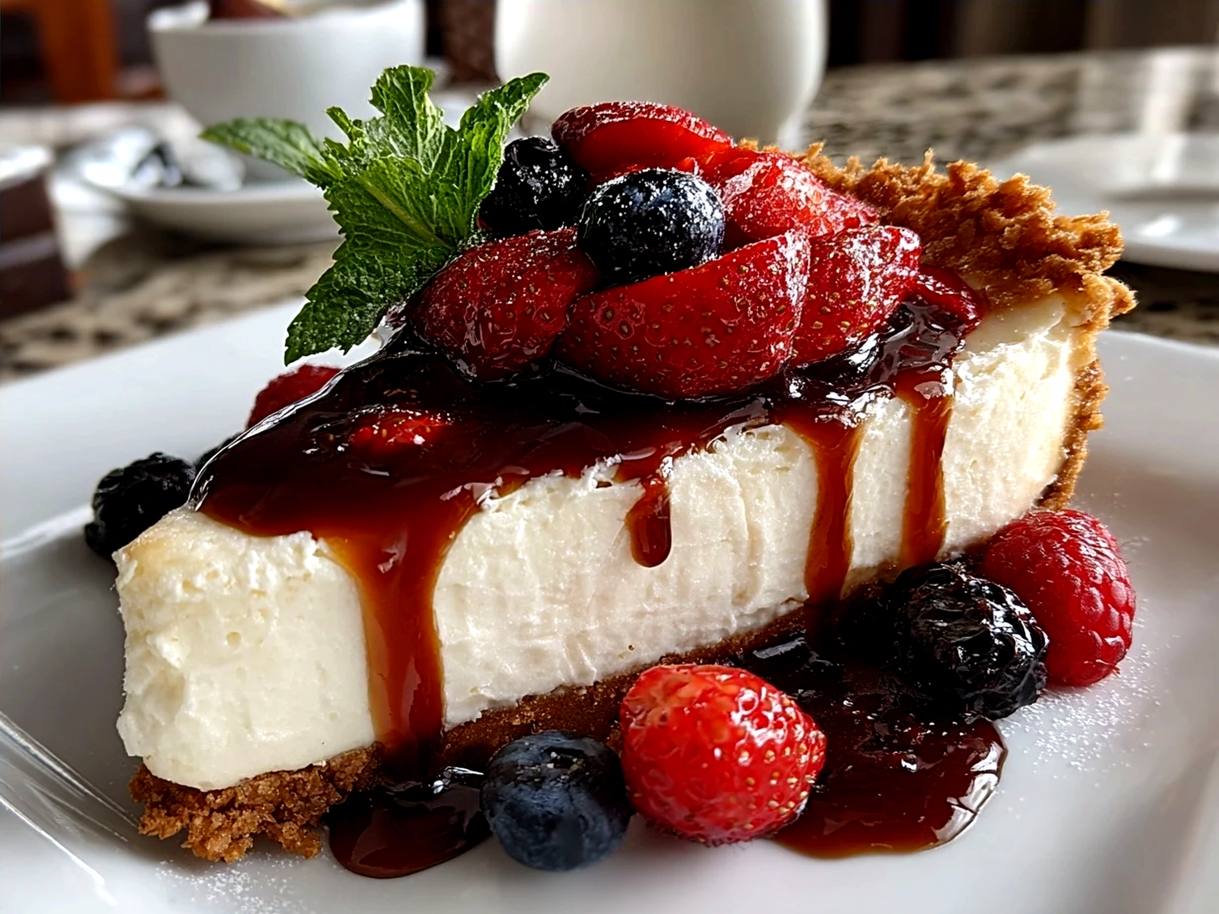 Served No Bake Classic Woolworth Cheesecake with fresh berries and cream