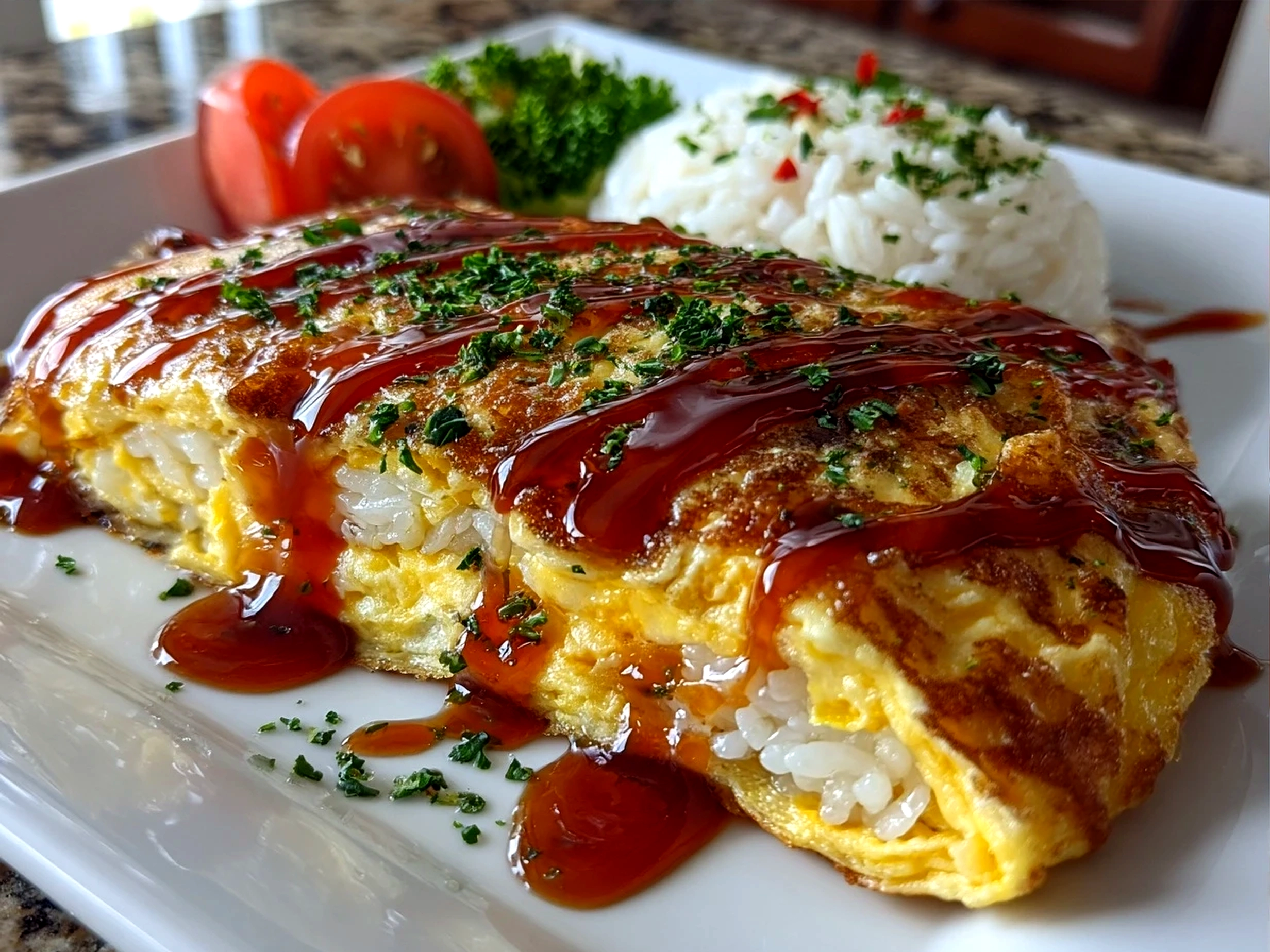 Final plated Omurice Japanese Rice Omelet served with greens