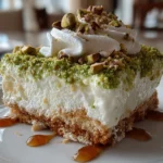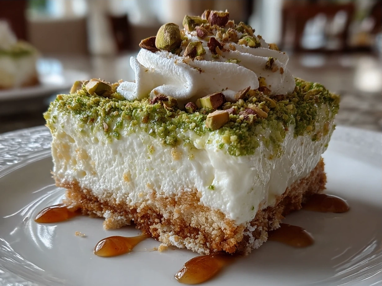 A rich and creamy layered pistachio dessert combining a buttery crust, pistachio pudding, and whipped cream for an indulgent treat perfect for any occasion.