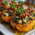 A festive and flavorful dish featuring roasted butternut squash halves stuffed with a traditional blend of symbolic Simanim ingredients, perfect for celebrating new beginnings.