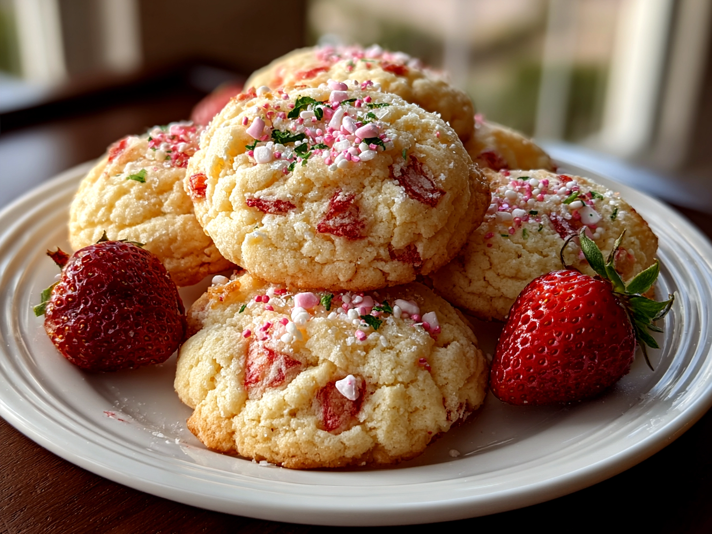 Delight in these soft and buttery Strawberry Kiss Cookies, featuring a tender cookie base topped with a sweet, fruity strawberry-flavored kiss candy. Perfect for spring gatherings or a charming treat any time.