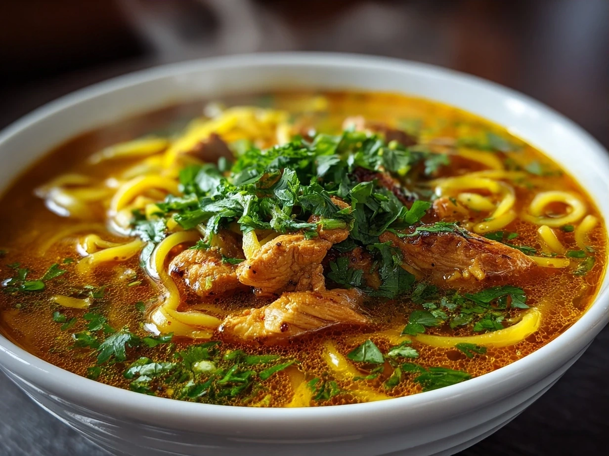A soothing and vibrant chicken noodle soup infused with the anti-inflammatory benefits of turmeric and fresh ginger, perfect for boosting immunity and comforting the soul.