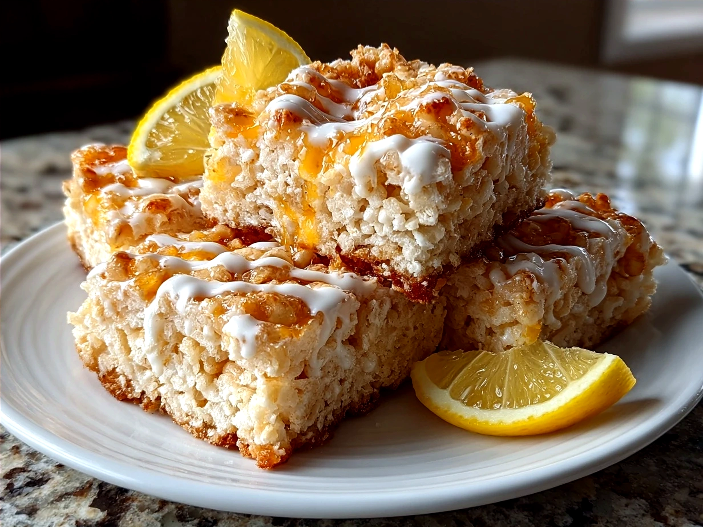 Freshly made Zesty Lemon Rice Krispie Treats served on a white plate with lemon garnishes